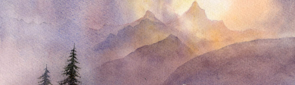In this composition high up on the Sundance Mountains of the Canadian Rockies I turned afternoon light into early evening by flooding the peaks with a transparent glaze of French Ultramarine and Alizarin Crimson, and deepening the shadows. Much of the rock surfaces I have left completely blank to increase the suggestion of strong light, while the shadow parts were painted with a weak mixture of French Ultramarine and cadmium red, then yellow ochre was floated in while it was still wet. When this had dried I drew in some fracture lines with a no. 1 rigger using French Ultramarine and burnt umber, applying more pressure to the brush in places to vary the width of the fractures.