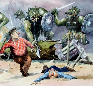 My involvement with the Doddies, or Llandoddies, as they come from Llandrindod Wells, goes back to the time when I first learned about the Battle of Aberdod. So amazing was the story of these legendary folk, I just had to put it down on paper. The picture illustrates a scene from the battle, which occurred on St Cewydd’s Day in 1913, St Cewydd being the patron saint of rain. Here you can see the sense of despair on the faces of the little Doddies as they are being overwhelmed by the villainous Grogs who are intent on putting the Doddies to the sword, stealing their cakes and also the Doddie ladies who bake them.